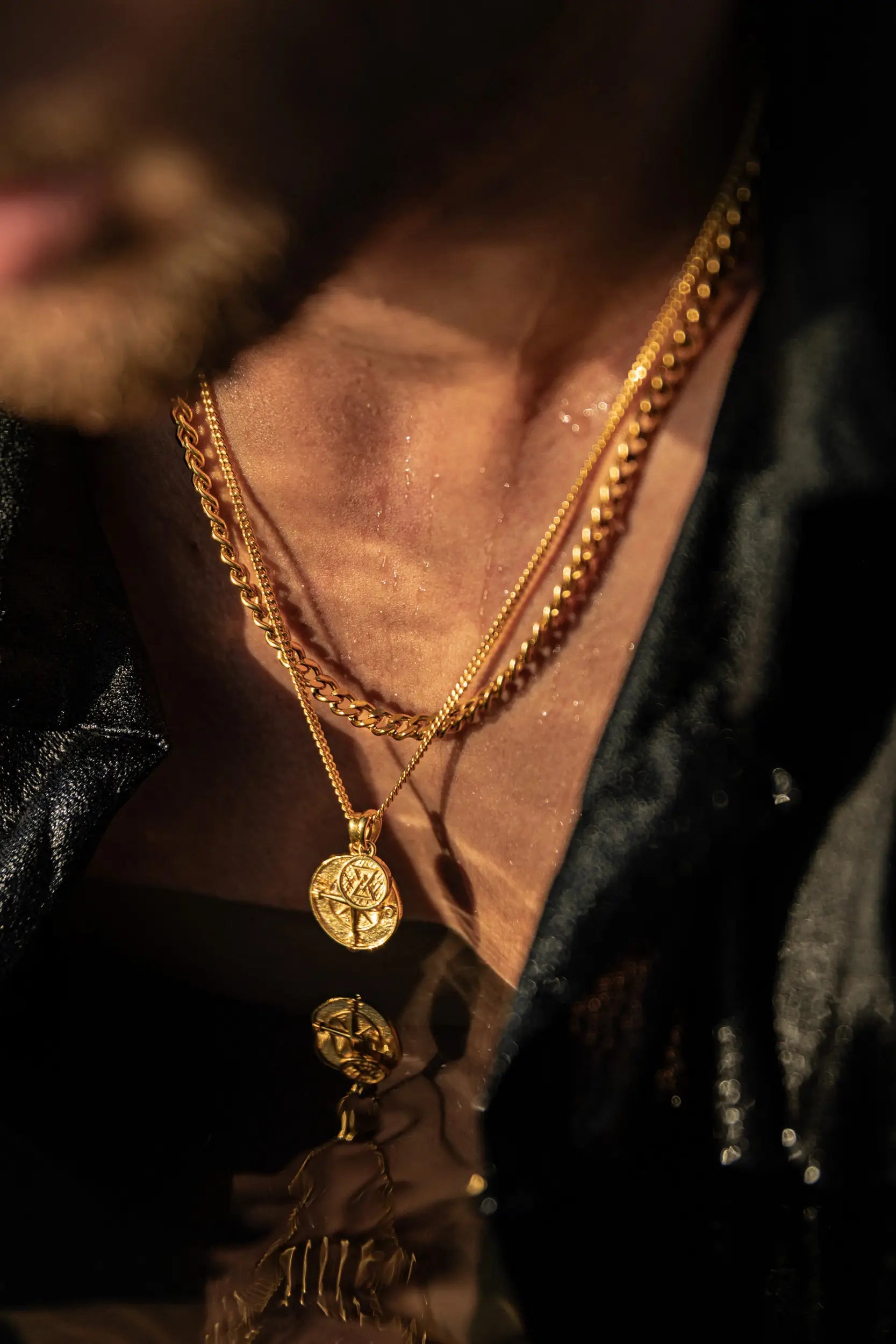 Une chaîne en acier inoxydable 316L, plaquée or 18 carats par procédé PVD, renommé pour sa résistance.
