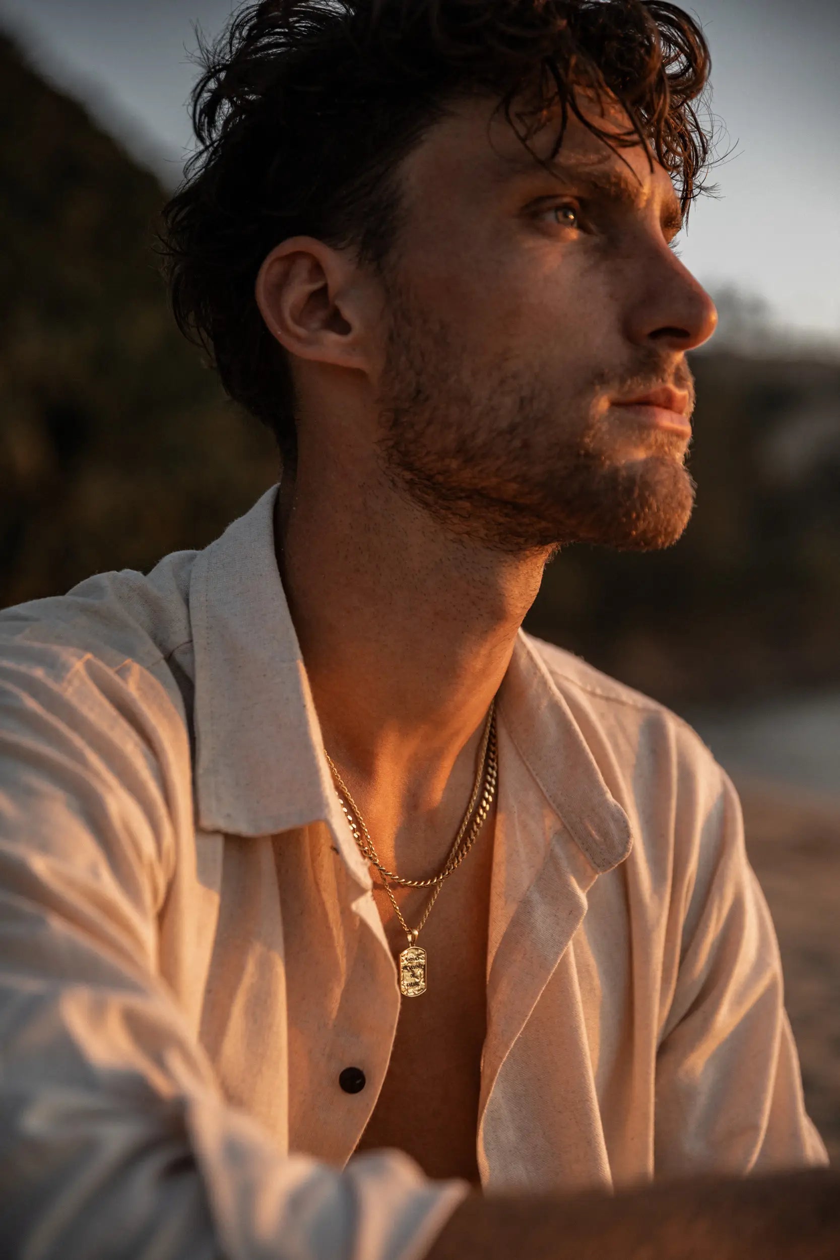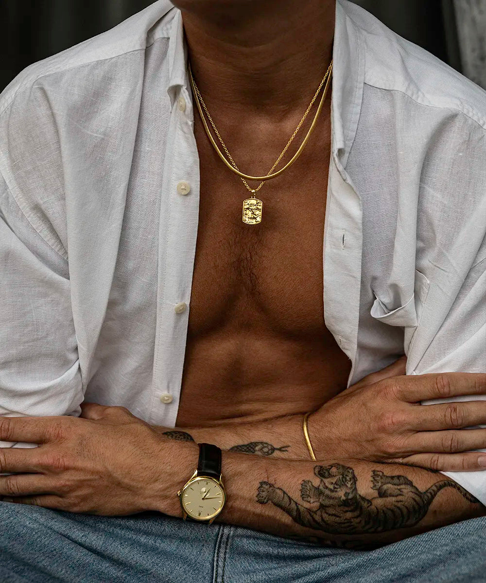 Une chaîne en acier inoxydable 316L, plaquée or 18 carats par procédé PVD, renommé pour sa résistance.