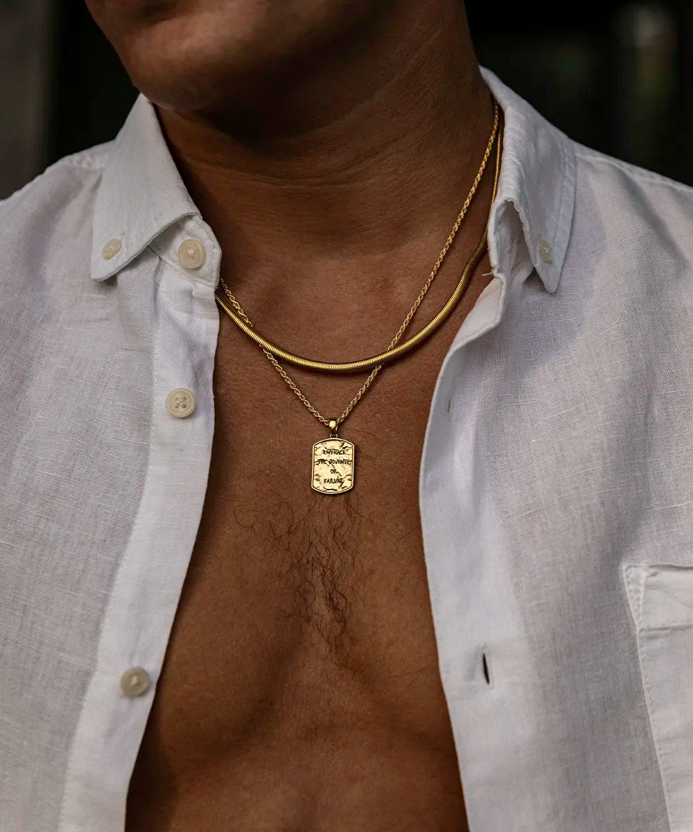 Une chaîne en acier inoxydable 316L, plaquée or 18 carats par procédé PVD, renommé pour sa résistance.